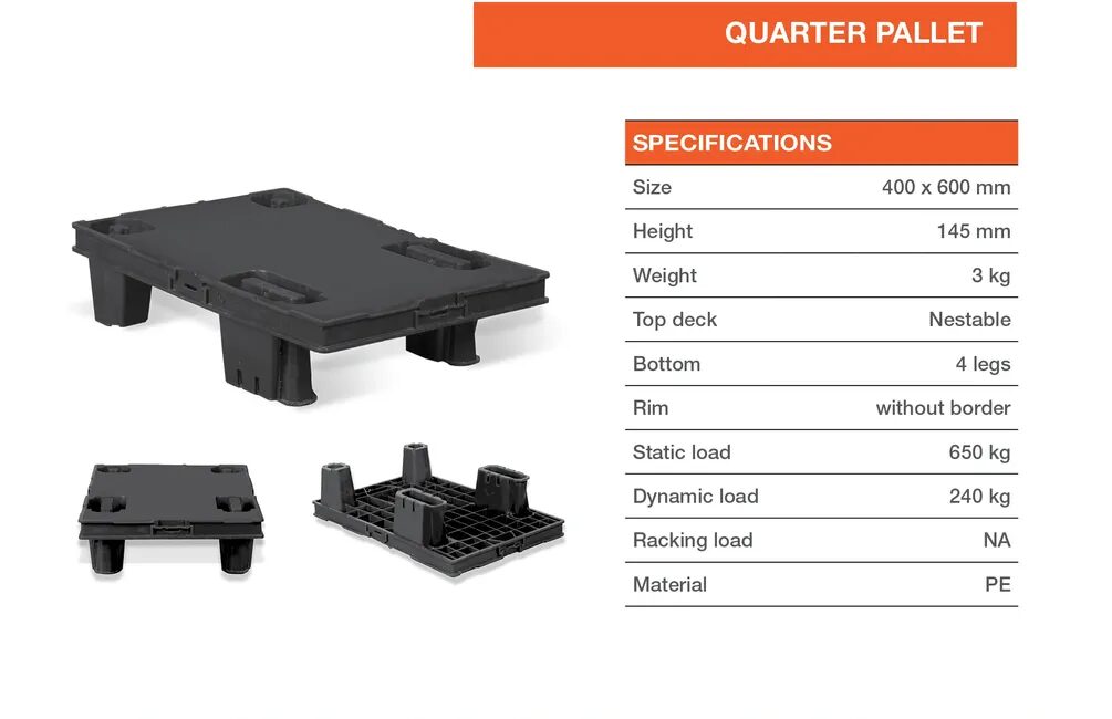 By virtue of the moulding process, and inherent quality control procedures involved in the hi-tech manufacturing process of plastic pallets, the dimensional accuracy and load ratings of plastic pallets are 100% consistent. Unlike a wooden pallet, which is constructed from a number of inconsistent parts of varying strength, plastic pallets are moulded under extreme pressure, in highly polished accurate moulds. The process itself produces an exceptionally high-quality product.